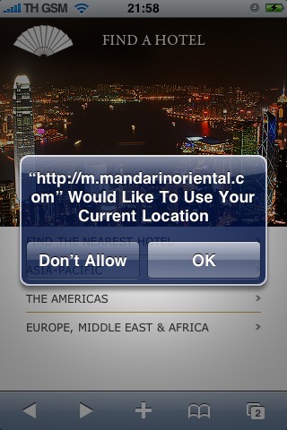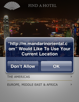 Clicking ‘Find the nearest hotel’ gives an alert asking to use your current location — something which is normally found only in iPhone apps.