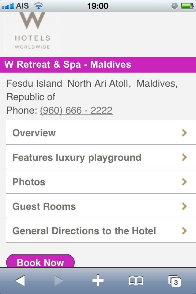 The property page continues the look and feel, and makes some attempt to provide interesting content. Saying that “Features luxury playground” lead to a single page of text, and “General Directions to the Hotel” lead to a page which apologised for the lack of directions (my fault for choosing the Maldives!).