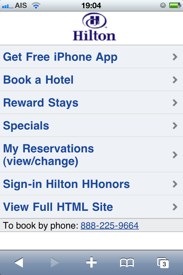 The eagerness of large brands to go for the same product from the same company (Usablenet.com) puzzles me slightly. Why is this happening? Well, Usablenet has spotted a niche, providing mobile versions of websites to a variety of industries apart from hospitality: indeed their client list is extremely impressive. To be clear, i’m not criticising Uablenet here, they are clearly providing a needed service. Really, my criticism is aimed at the lack of imagination on the part of the major brands. This could be due to a lack of expertise — although given the low barriers to entry for building mobile sites, that’s unlikely — i rather think it is a classic case of the inertia of IT departments in large corporations.